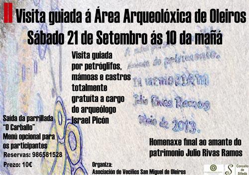 A parroquia de Oleiros acolle o sábado día 21 unha visita guiada á súa área arqueolóxicaSilleda, 14 de setembro de 2013. O vindeiro sábado día 21 terá lugar a segunda edición da visita guiada a área arqueolóxica de Oleiros, O sábado celébrase o roteiro pola Área Arqueolóxica de Oleiros, unha das zonas de Galicia con máis elementos patrimoniais. A cita está organizada pola Asociación de Veciños San Miguel de Oleiros, coa colaboración da Concellería de Cultura e Turismo. O percorrido, duns 5 kilómetros, partirá dende o restaurante O Carballo ás 10.00 horas e estará guiado de novo polo arqueólogo silledense Israel Picón, natural de Refoxos, que fará unha explicación dos distintos elementos (mámoas, castros e petróglifos) que figuran ao longo da ruta. Recoméndase aos asistentes acudir con roupa cómoda e calzado axeitado para camiñar por zona de monte. Así mesmo, ao remate do percorrido terá lugar un acto de homenaxe a Julio Rivas Ramos, silledense falecido o pasado mes de maio, e un gran amante do patrimonio arqueolóxico. O acto terá lugar xunto á mámoa de Porta do Carro, descuberta por Rivas, gracias ao que tamén se acadou a catalogación do Castro da Devesa, na parroquia de Oleiros. Os asistentes que o desexen poden participar tamén no xantar posterior na Parrillada O Carballo cun menú ao prezo de 10 euros (resevas no 986 581528). Dende a Concellería de Cultura e Turismo, que dirixe Margarita Campos, anímase á cidadanía a asistir a esta visita, de grande interese tamén dende o punto de vista paisaxístico e medioambiental. O roteiro naceu o pasado ano, cunha elevada participación, como parte dunha iniciativa para a posta en valor da área arqueolóxica con dúas mámoas, unha ducia de petróglifos e castros coma o de As Orelas ou Montaz.